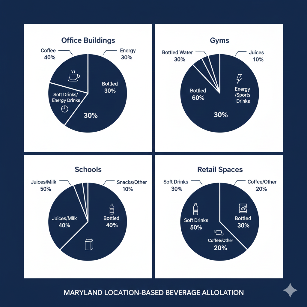 The numbers: Maryland operators report water accounting for 23-28% of total beverage revenue across mixed-location routes. Health-conscious demographics in Montgomery County and Howard County drive this higher—some operators see water hitting 35% in these zones.