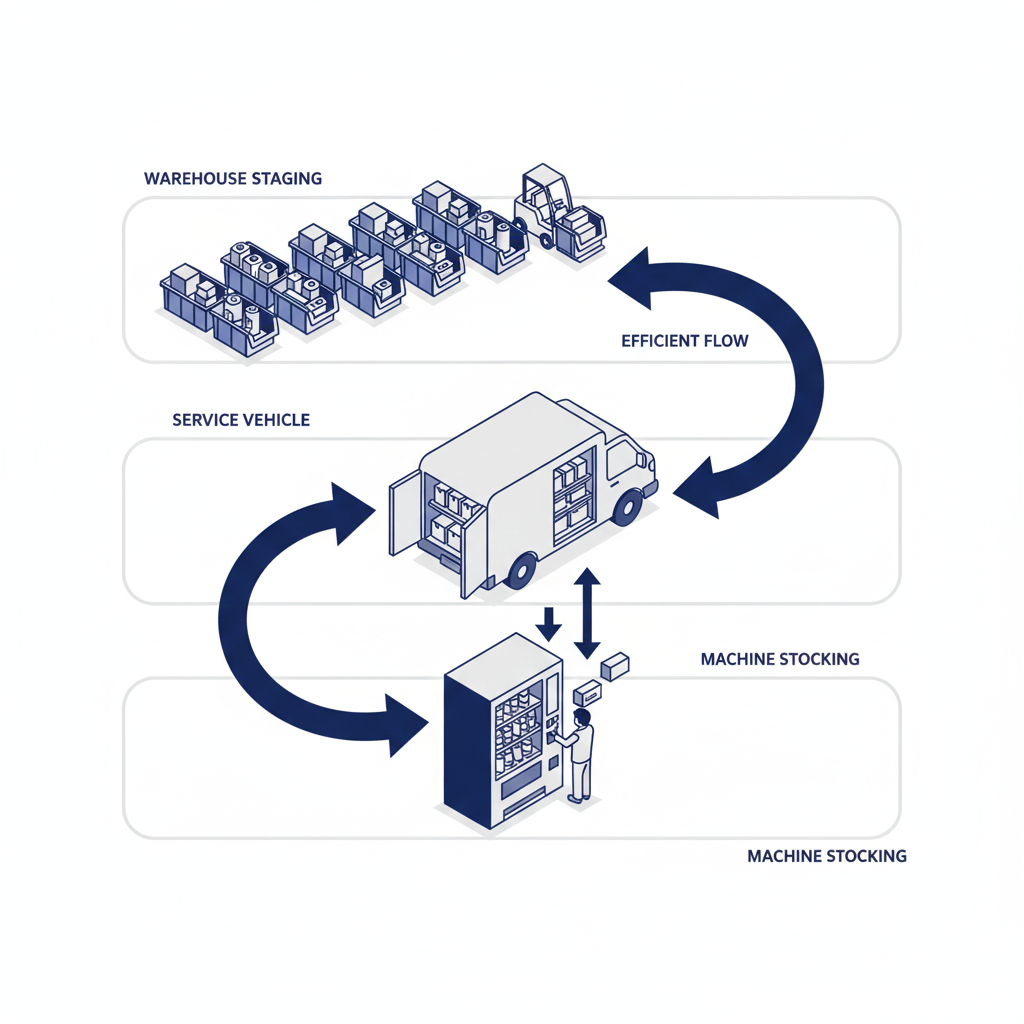 Distribution efficiency in vending machine logistics means minimizing the total system cost of moving products from your supplier to the customer. This includes warehouse receiving, inventory staging, vehicle loading, machine stocking, and empty product removal.