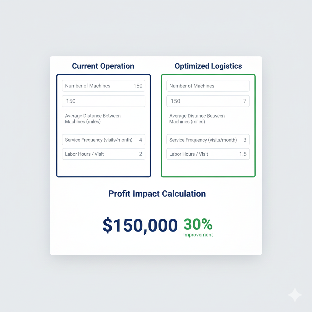 The density multiplier effect: Every mile of separation between machines doesn’t just add drive time—it multiplies your cost structure across every service visit for the lifetime of that machine placement. A machine 10 miles from your route center costs you 20 miles round-trip, every single service visit, forever.